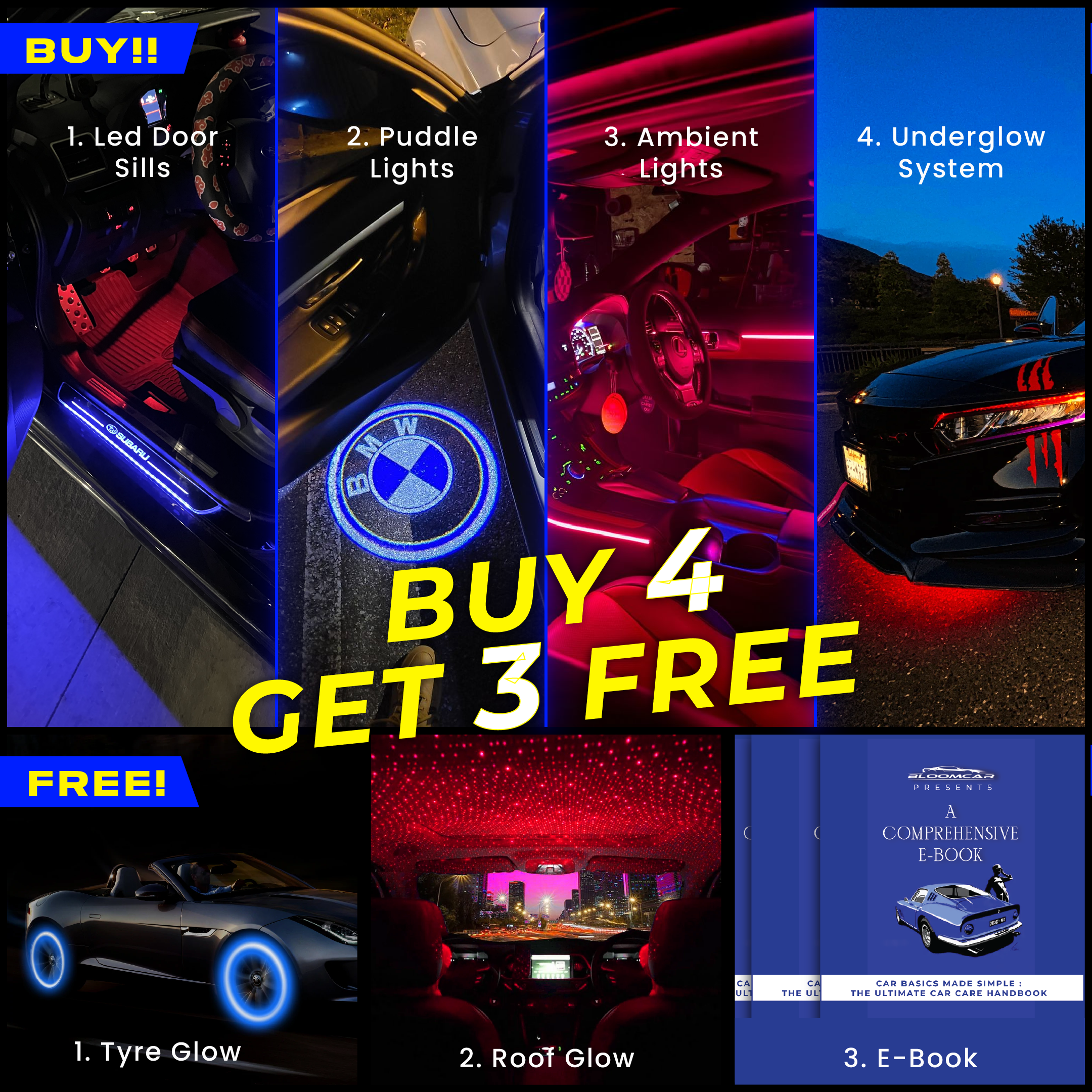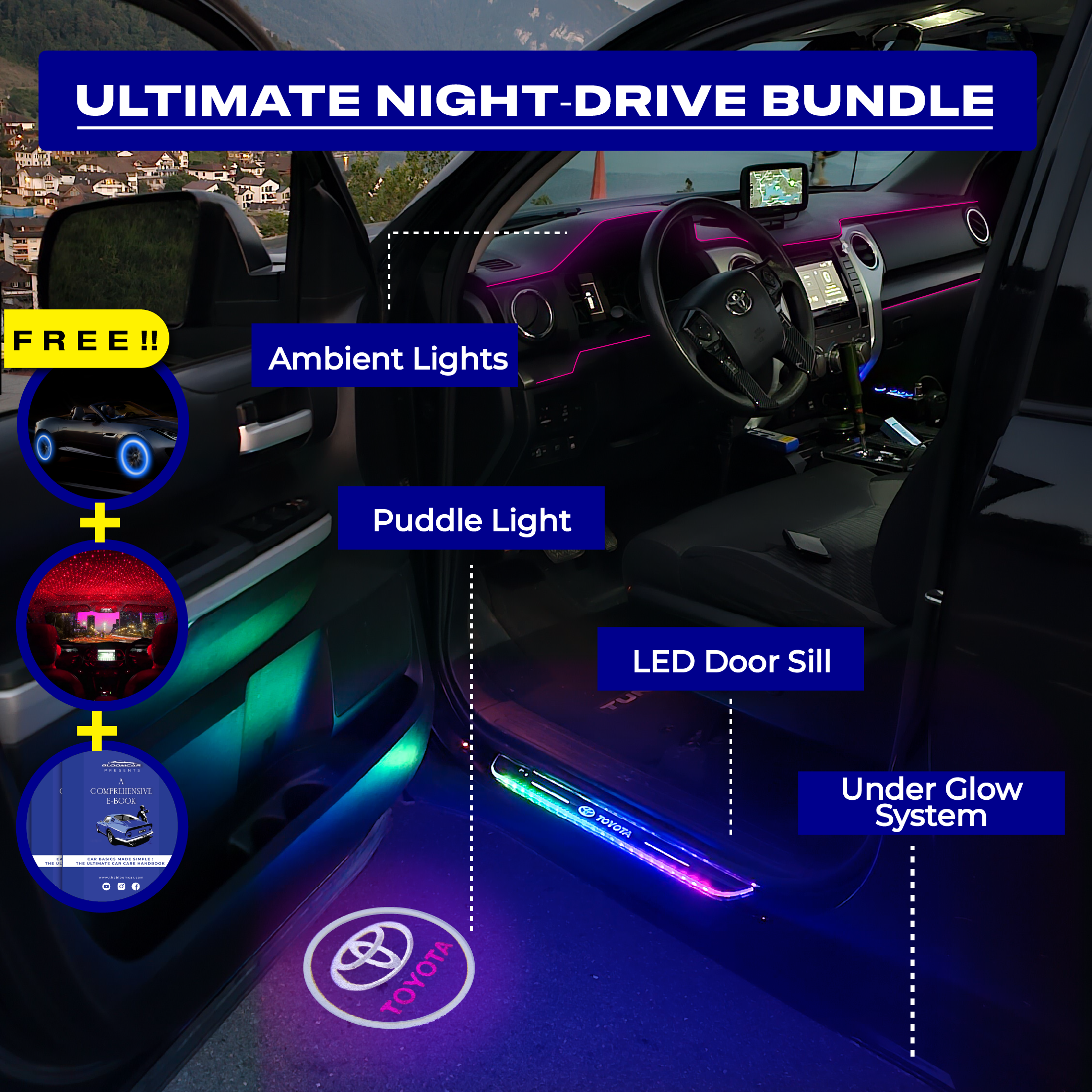 With the sleek LED Door Sills, head-turning Under Glow, and customizable Ambient Lights, this bundle brings a new dimension to your car. Add the bold Puddle Lights for that extra flair, and you have the ultimate combination of style and functionality for every night drive.